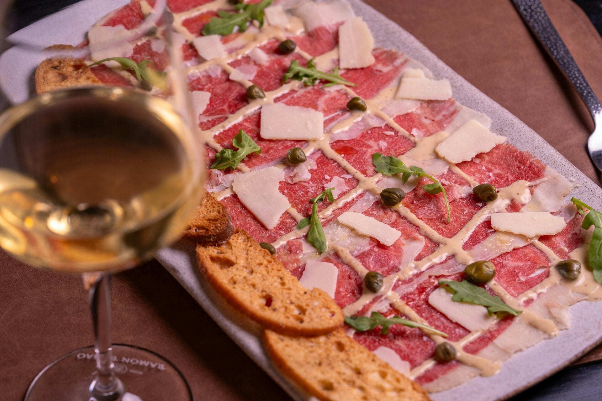 - Broodje carpaccio met Parmezaanse kaas, truffelmayonaise en pitjes